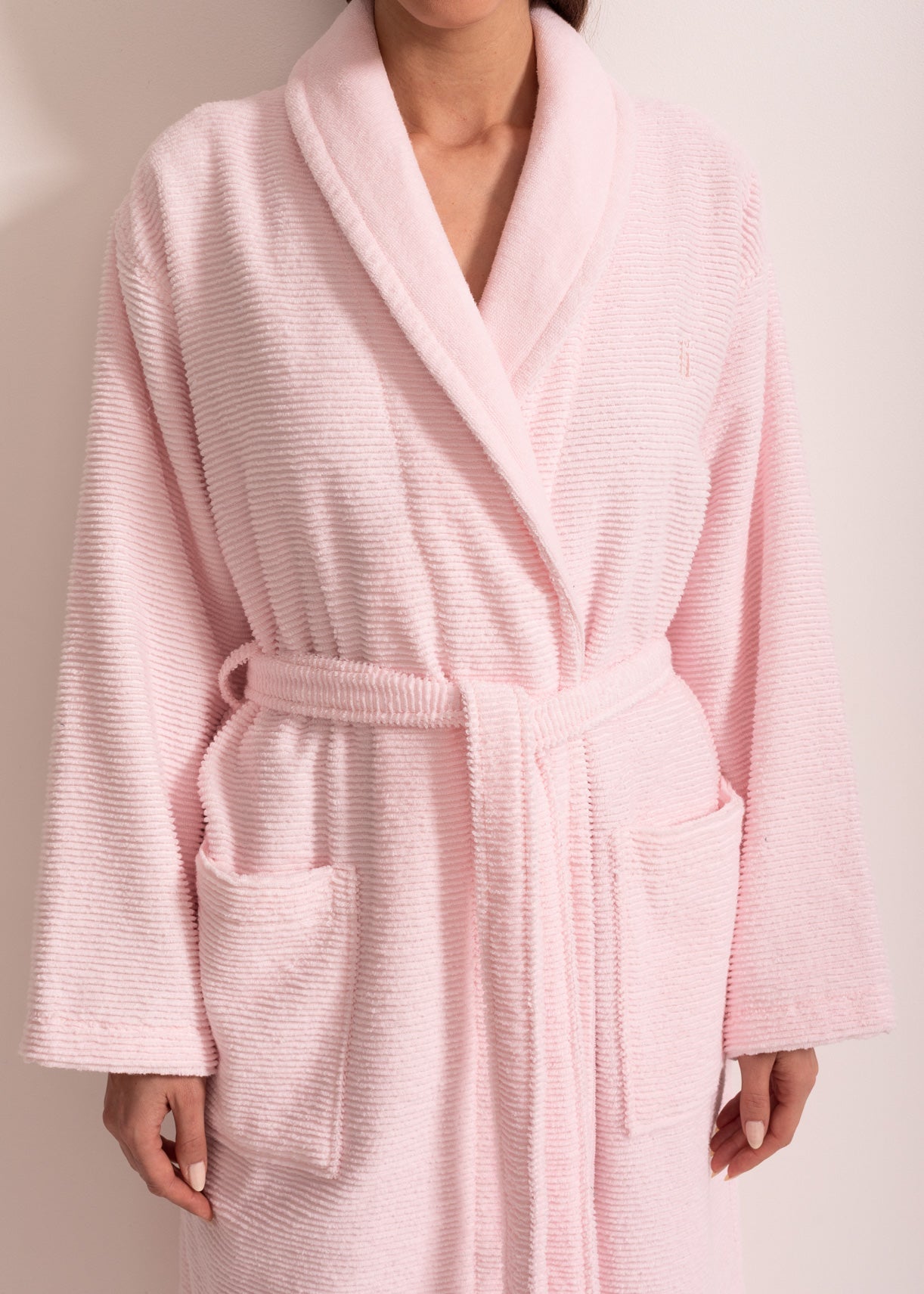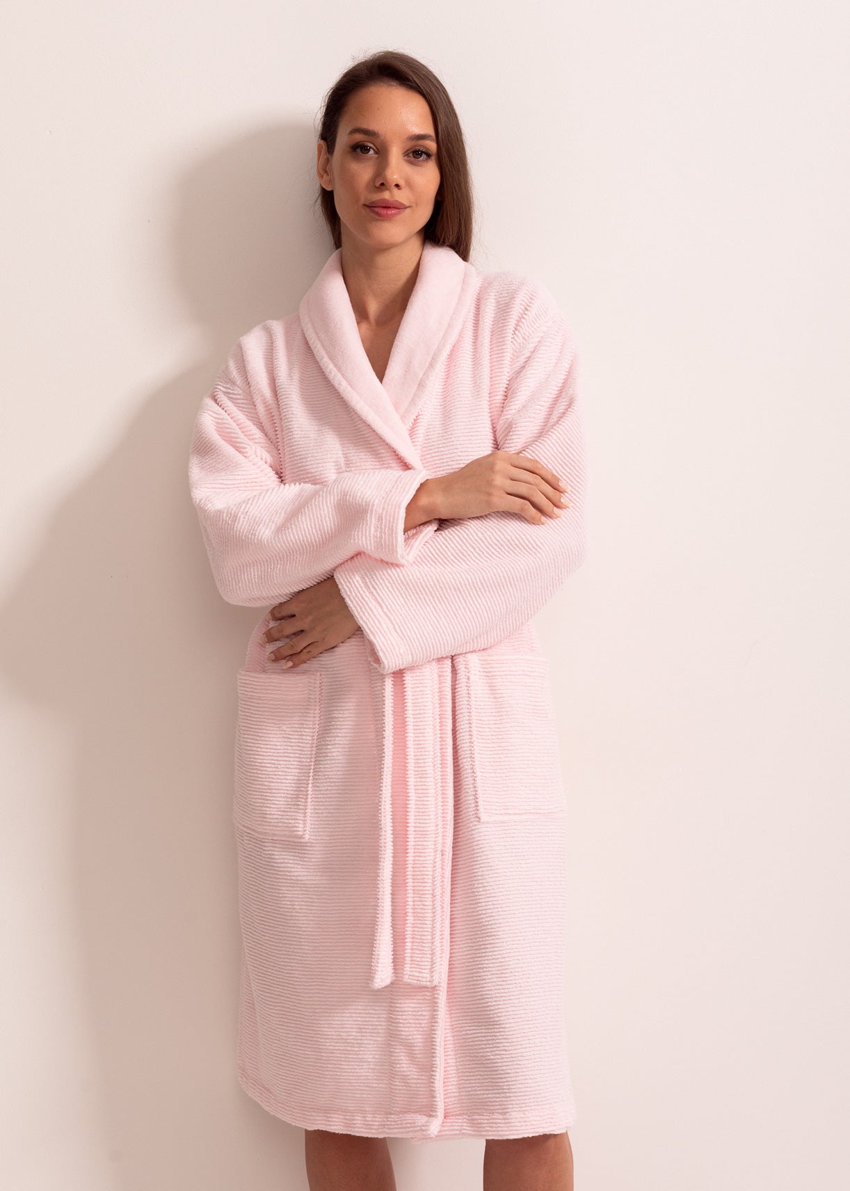 Modelul este prevăzut cu guler șal, pentru un aspect rafinat și elegant, și buzunare largi, ideale pentru confortul zilnic. Croiul generos asigură libertate de mișcare și o purtare relaxată, perfectă pentru momentele de răsfăț acasă.