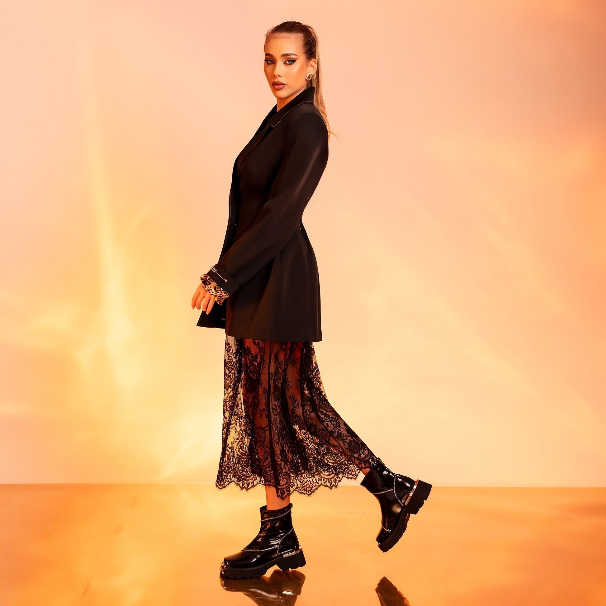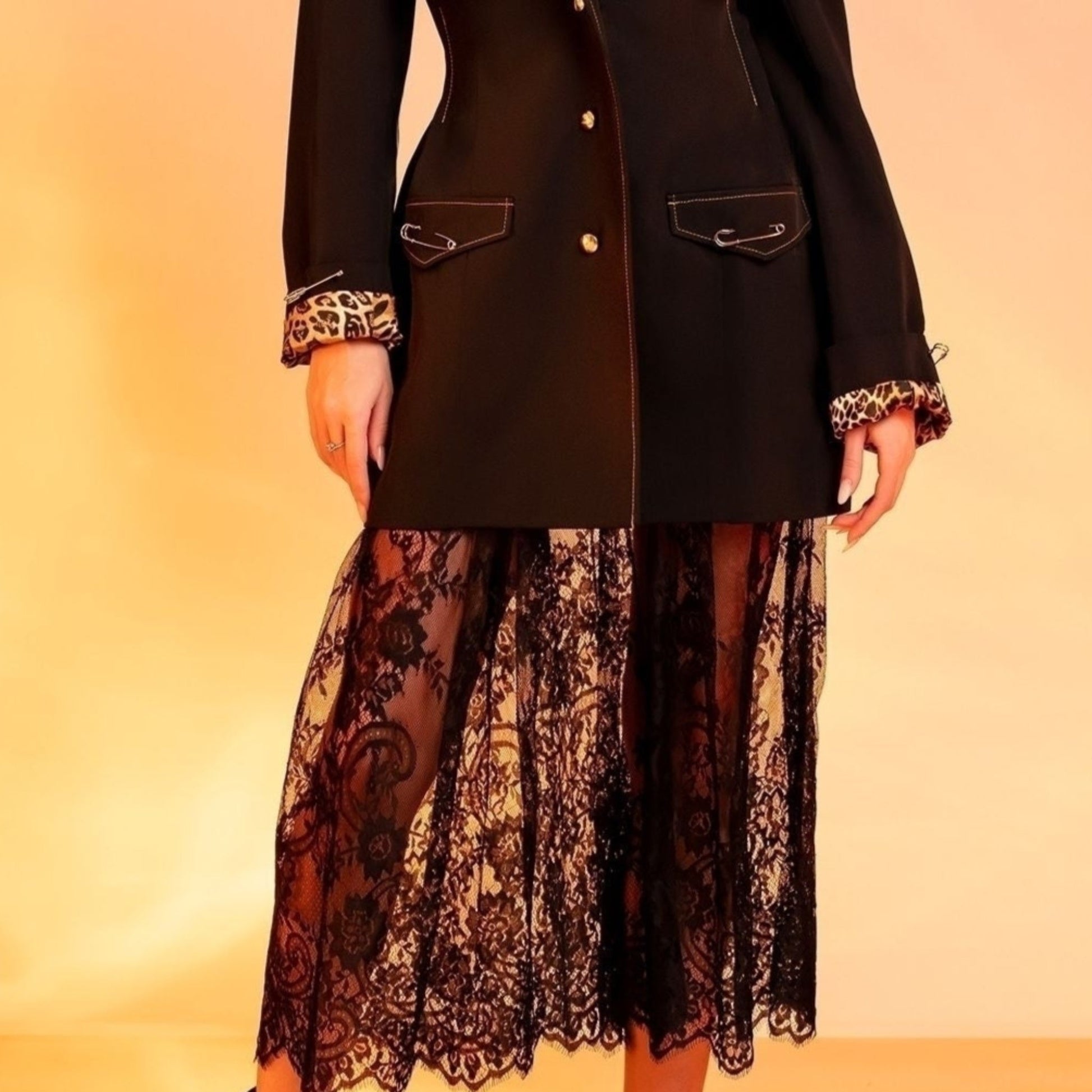 • Mod de purtare: sacoul poate fi purtat simplu sau împreună cu fusta din dantelă și topul din bumbac, complet detașabile