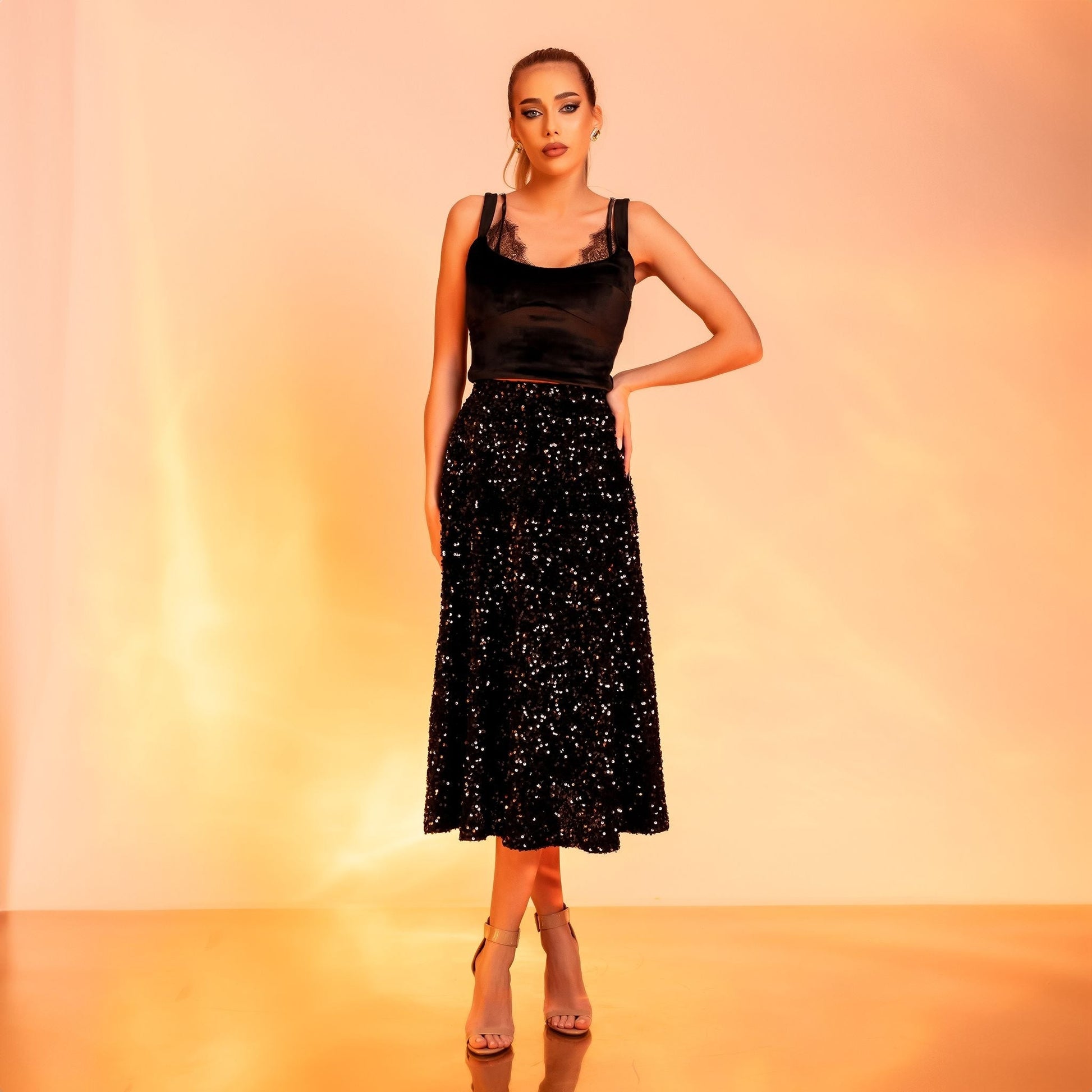 The lace cups, delicate and refined, subtly contour the neckline, highlighting sensuality without compromising elegance. These are non-detachable, seamlessly integrated into the top’s design for a harmonious effect.