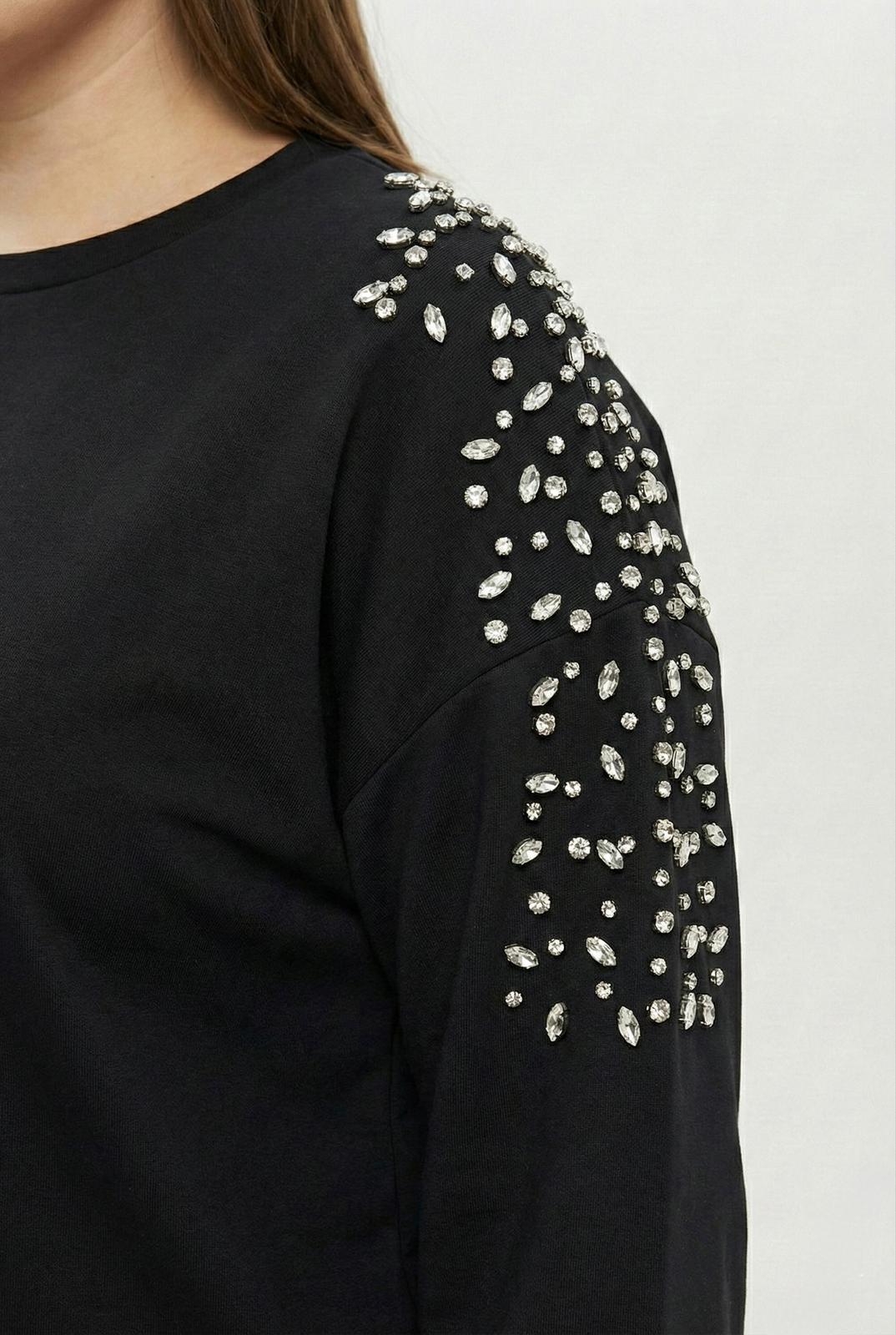 • Bluză cu mânecă lungă, decorată cu pietre aplicate pe umeri, ce adaugă un efect subtil de eleganță și feminitate