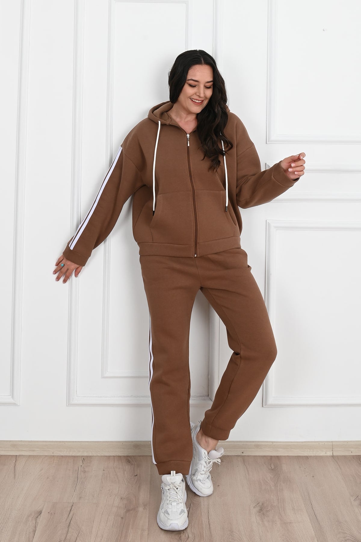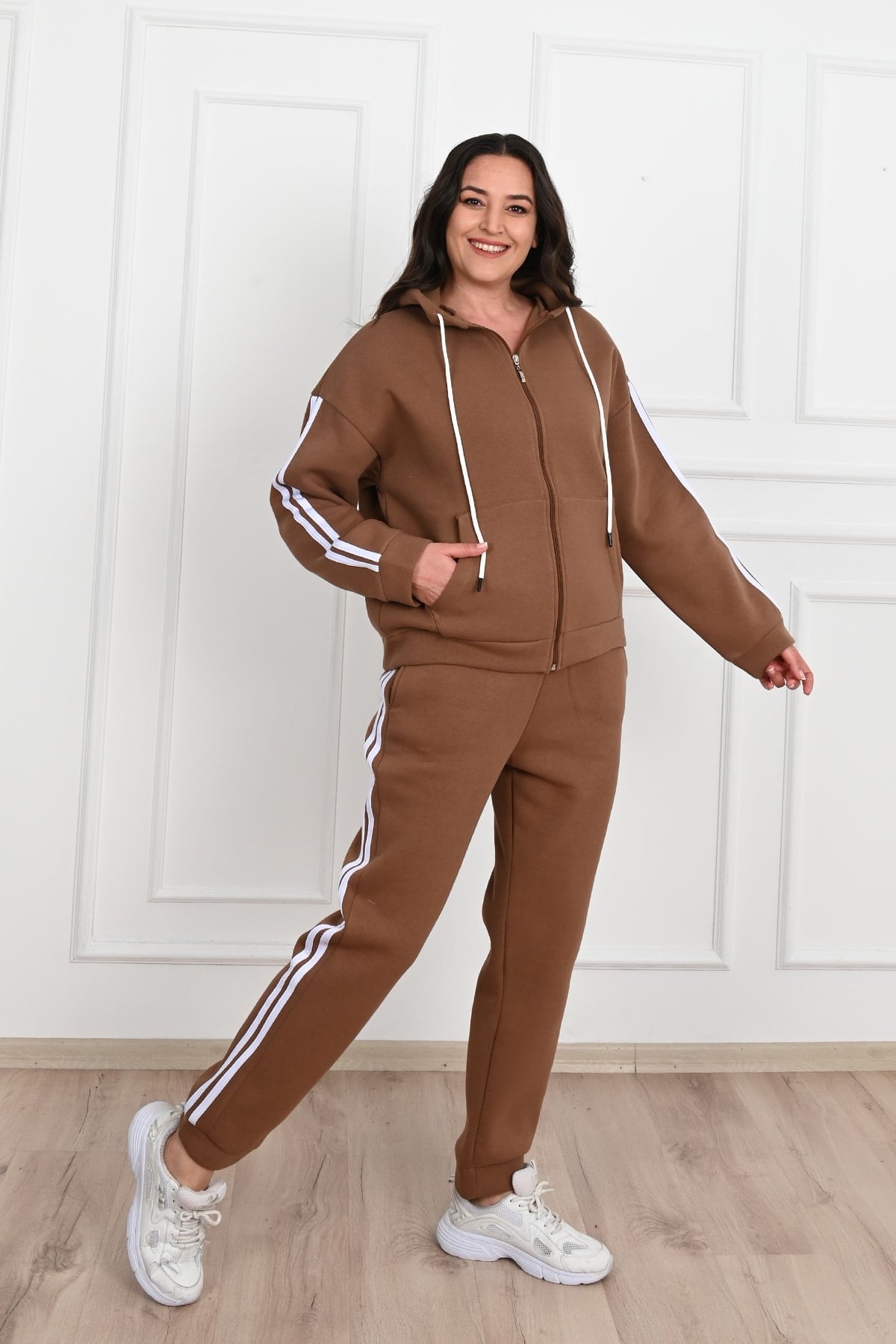 Trening damă realizat din bumbac vătuit de calitate superioară, ideal pentru sezonul rece și pentru un stil casual modern. Materialul gros și moale oferă confort termic și o senzație plăcută la purtare, fiind perfect pentru activități zilnice sau momente de relaxare.