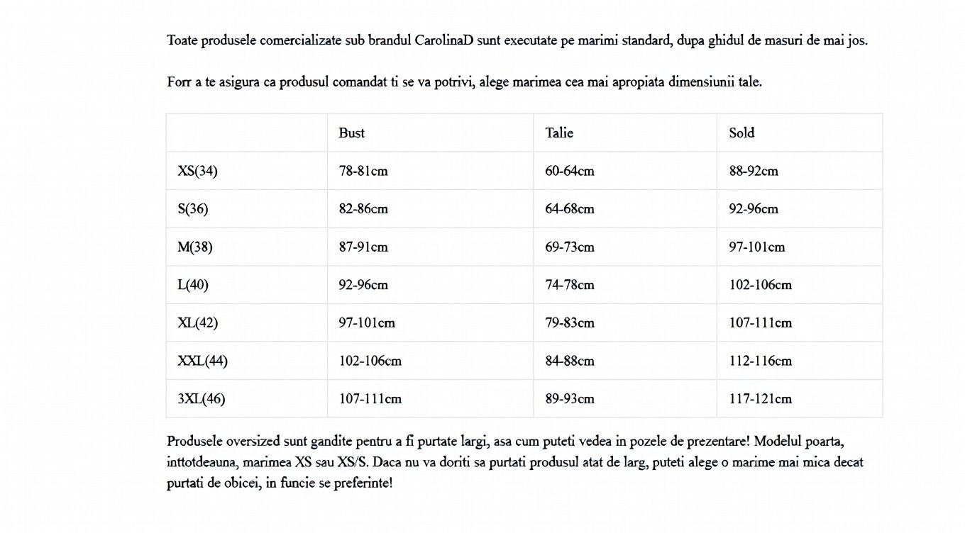 Pentru un fit perfect, măsoară circumferințele bustului, taliei și șoldurilor și alege mărimea conform tabelului standard european